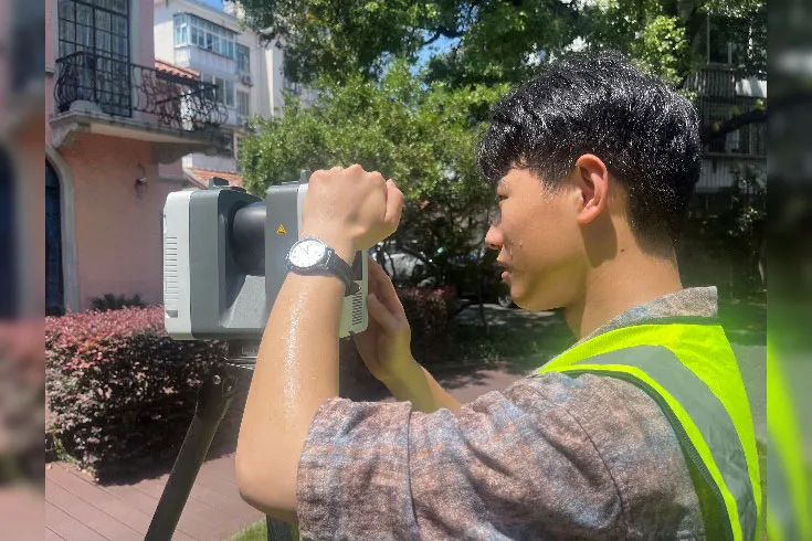 在上海文藝醫(yī)院優(yōu)秀歷史建筑檢測(cè)的第一線,團(tuán)隊(duì)頂著38度的酷暑,汗如雨下,汗水浸透衣衫,保質(zhì)保量地完成外立面3D激光掃描作業(yè)任務(wù),全力保障項(xiàng)目順利推進(jìn)。