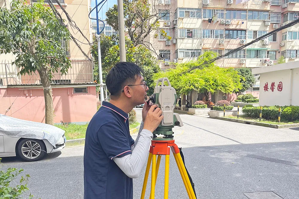 在老滬閔路房屋安全性能檢測(cè)項(xiàng)目中,團(tuán)隊(duì)頂著高溫酷暑,不顧汗水流淌,扛著沉重的儀器,用細(xì)致嚴(yán)謹(jǐn)?shù)膽B(tài)度,走街串巷完成測(cè)量任務(wù)。