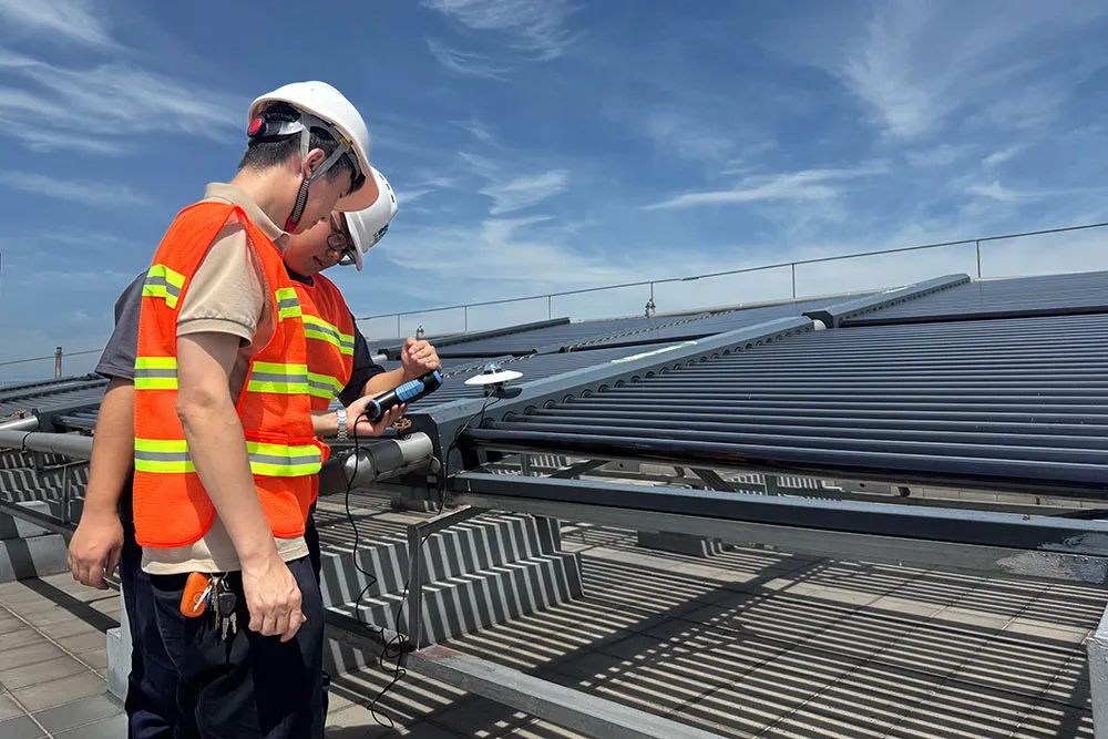 在臨港新片區(qū)的南匯新城超低能耗建筑工程現(xiàn)場(chǎng),團(tuán)隊(duì)不畏酷暑,頂著太陽(yáng)直射、冒著屋面高溫,開(kāi)展建筑可再生能源系統(tǒng)的性能現(xiàn)場(chǎng)檢測(cè),為超低能耗建筑的可再生能源有效利用保駕護(hù)航。