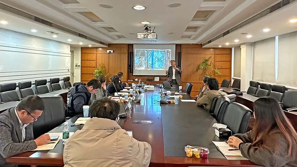 Quenneville教授作了題為《Seismic design of resilient structures —— a perspective》的學(xué)術(shù)報(bào)告,報(bào)告中介紹了韌性摩擦自復(fù)位阻尼器的最新研究進(jìn)展,以及無損傷建筑結(jié)構(gòu)建造和低損傷既有結(jié)構(gòu)加固技術(shù)的工程應(yīng)用案例。結(jié)構(gòu)所副所長冷予冰介紹了上海建科院的科技創(chuàng)新與發(fā)展情況,以及在工程結(jié)構(gòu)抗震韌性領(lǐng)域開展的研究與技術(shù)服務(wù)。參會人員與Quenneville教授圍繞自復(fù)位結(jié)構(gòu)及消能減震技術(shù)研究進(jìn)行了深入交流。