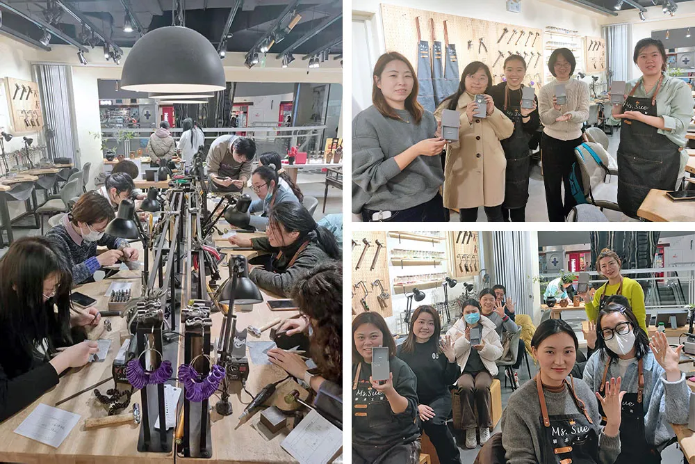 3月4日和3月5日,上海建科院的女職工們在專業(yè)技藝?yán)蠋煹膸ьI(lǐng)下,通過鏨刻、雕琢等工藝,將銀片打磨成獨(dú)一無二的戒指或吊墜,親身感受古老銀飾“以紋載史”的文化內(nèi)涵,沉靜專注中仿佛觸摸到了時間的溫度。