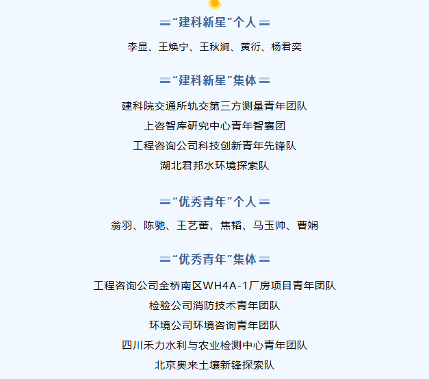 經過激烈角逐,5名青年獲評“建科新星”個人,4個集體獲評“建科新星”集體,6名青年獲評“優(yōu)秀青年”個人,5個集體獲評“優(yōu)秀青年”集體。