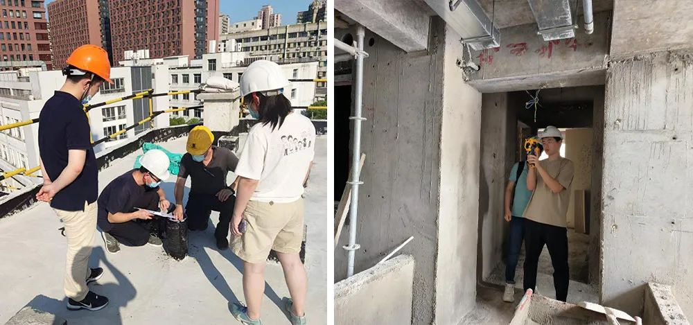 低碳院檢測認證團隊在超過37°的屋頂上,對宛平南路75號科研辦公樓改擴建項目屋面施工情況進行仔細檢查,有力保障超低能耗施工實施。在自貿(mào)區(qū)臨港新片區(qū)PDC1-0401單元頂尖科學(xué)家社區(qū)H02-02地塊項目中,團隊對樣板房進行氣密性和熱工缺陷的現(xiàn)場檢測。烈日當頭,團隊不畏高溫酷暑,在超低能耗建筑施工現(xiàn)場檢測及巡檢的工作中,及時發(fā)現(xiàn)問題、解決問題,保障項目順利推進。
