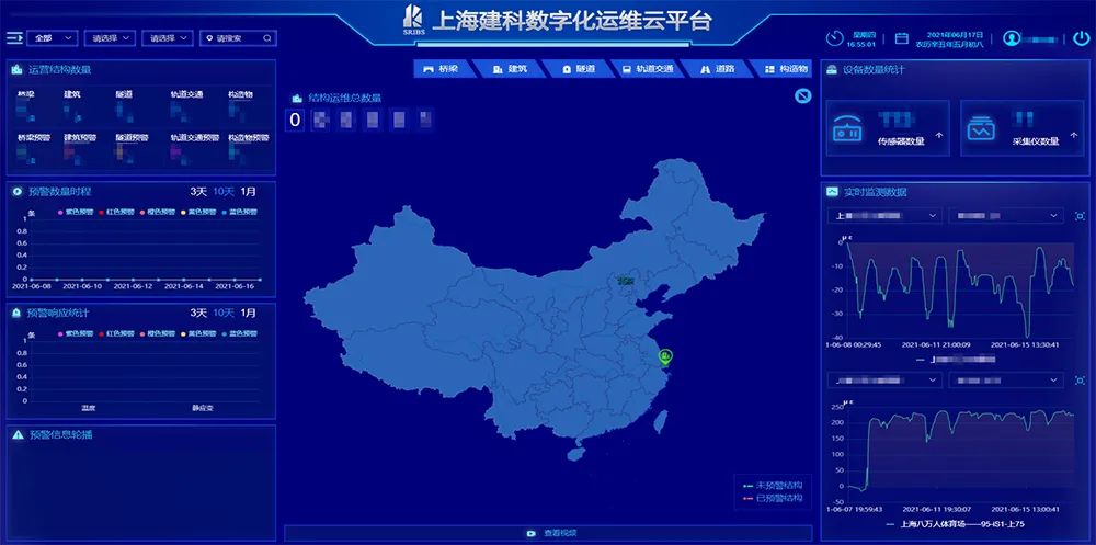 上海建科自主研發(fā)的數(shù)字化運維云平臺,可對建筑結(jié)構(gòu)、橋梁隧道、軌道交通工程施工及使用期間的安全狀況進行在線、連續(xù)、實時的監(jiān)測和預(yù)警。
