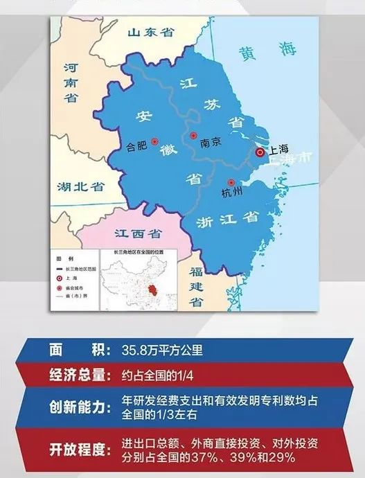 中共中央、國務院于2019年12月1日印發(fā)《長江三角洲區(qū)域一體化發(fā)展規(guī)劃綱要》,規(guī)劃范圍包括上海市、江蘇省、浙江省、安徽省全域(面積35.8萬平方公里),長江三角洲區(qū)域一體化發(fā)展并上升為國家戰(zhàn)略。