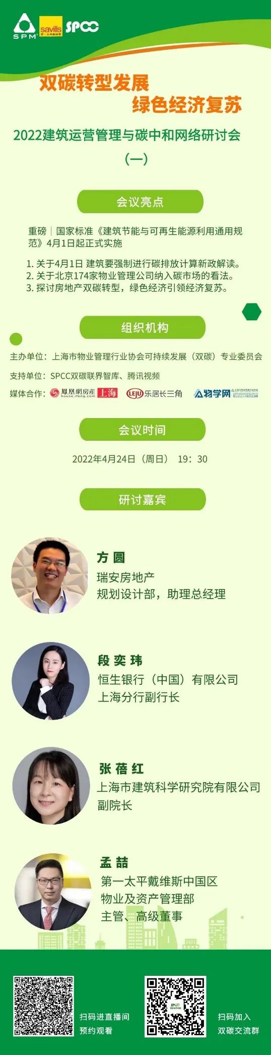 2022年4月24日(周日)晚19點30分,上海建科院、第一太平戴維斯、瑞安房地產、恒豐銀行圍繞“雙碳轉型發(fā)展,綠色經濟復蘇”,為大家做精彩分享,盡情期待。