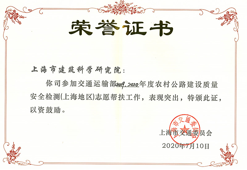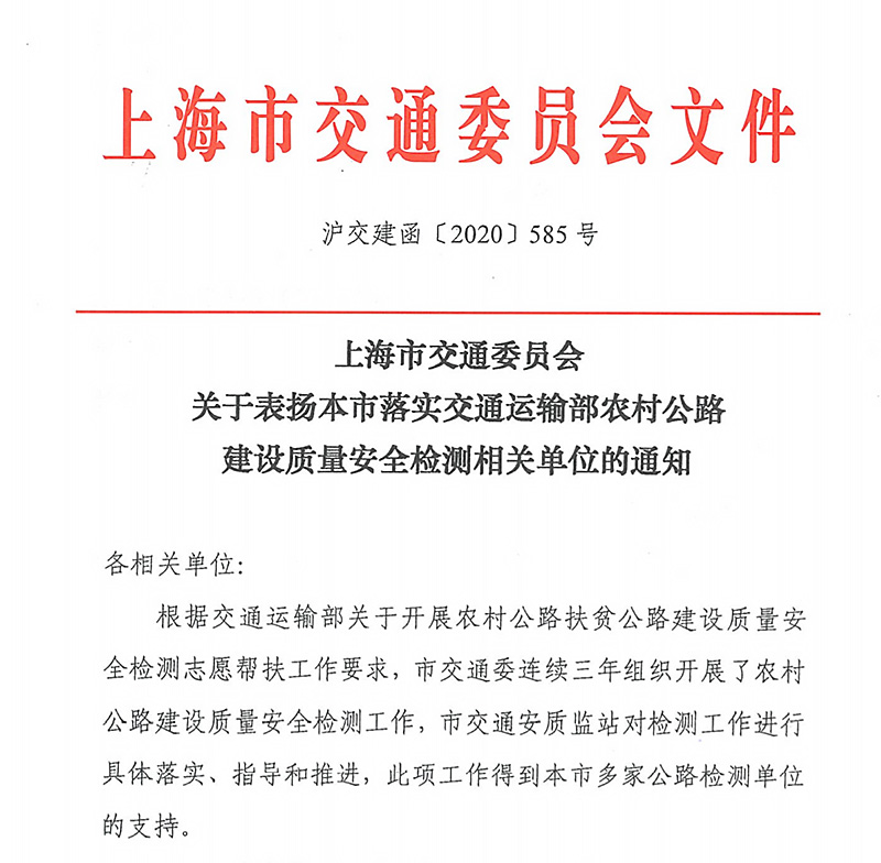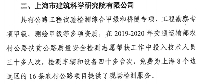 2020年9月29日,上海市交通委員會組織召開農(nóng)村公路建設(shè)工作會議。會上,上海市建筑科學(xué)研究院有限公司作為農(nóng)村公路建設(shè)質(zhì)量安全檢測(上海地區(qū))志愿幫扶單位,因工作表現(xiàn)突出成為受到市交通委通報表揚的三家單位之一。