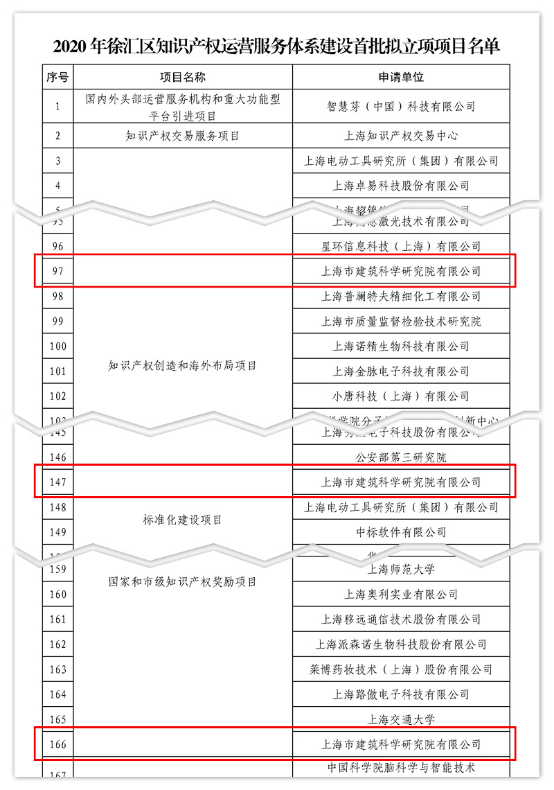 近日,上海市徐匯區(qū)市場監(jiān)督管理局發(fā)布了關于知識產(chǎn)權運營服務體系建設首批擬立項項目名單的公示,上海市建筑科學研究院有限公司分別獲得“知識產(chǎn)權創(chuàng)造和海外布局項目”、“標準化建設項目”、“國家和市級知識產(chǎn)權獎勵項目”立項支持。