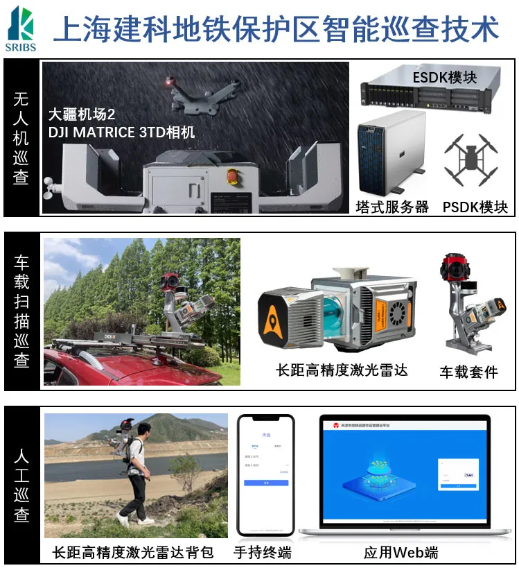 隨著“低空經(jīng)濟”今年被首次寫入政府工作報告中,我國民用無人機技術得到飛速發(fā)展。上海建科院在上海市域軌交范圍內(nèi)共設置了10余個無人機場,覆蓋建設期及運營期線路數(shù)百公里,可完成每周2次以上的全線保護區(qū)精細巡查任務。此外,對于處在禁飛區(qū)內(nèi)的地鐵保護區(qū)線路,借助高精度激光點云掃描技術,采用車載或人巡的方式開展外部風險巡查工作。