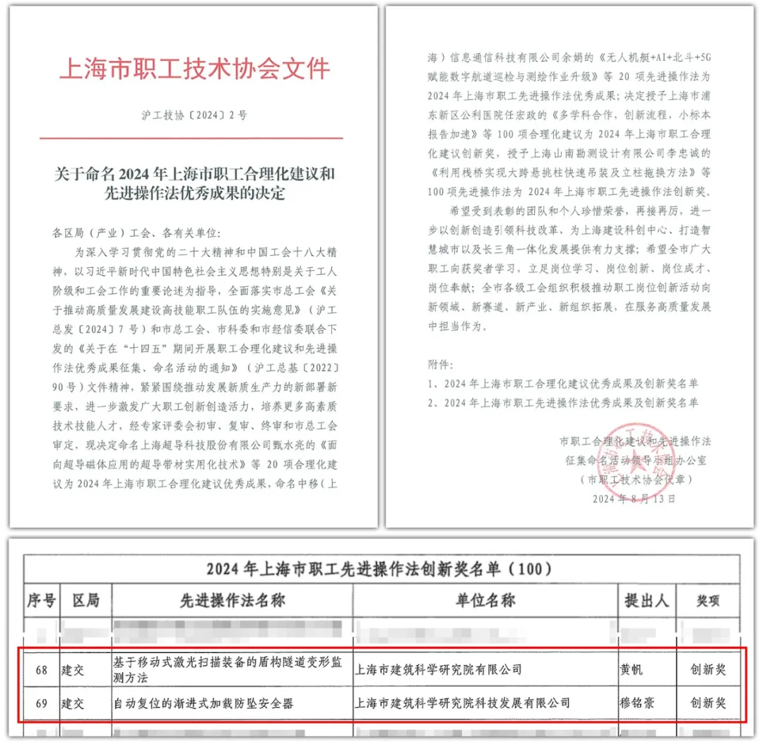 近日,上海市職工技術協(xié)會發(fā)文《關于命名2024年上海市職工合理化建議和先進操作法優(yōu)秀成果的決定》,上海市建筑科學研究院有限公司的2項成果成功入選,并榮獲2024年上海市職工先進操作法創(chuàng)新獎。