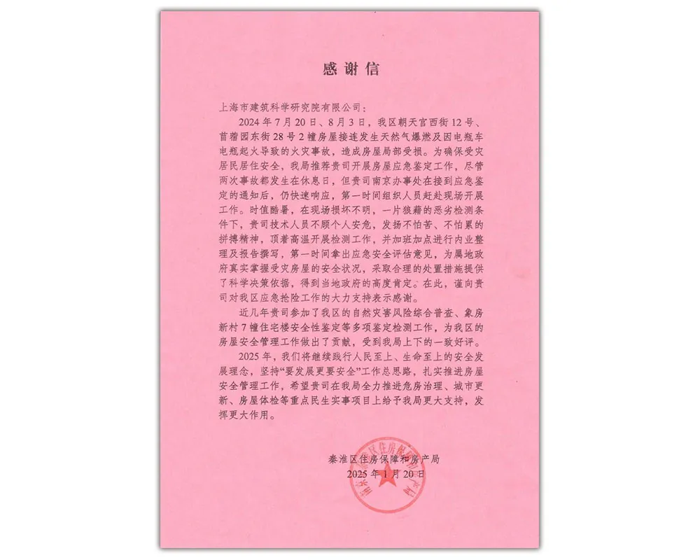 近日,南京市秦淮區(qū)住房保障和房產(chǎn)局向上海市建筑科學研究院有限公司發(fā)來感謝信,就上海建科院南京辦事處配合秦淮區(qū)局推進房屋安全管理工作,尤其在快速響應房屋災后應急安全鑒定方面的支持及做出的成績給予高度肯定并表達感謝。