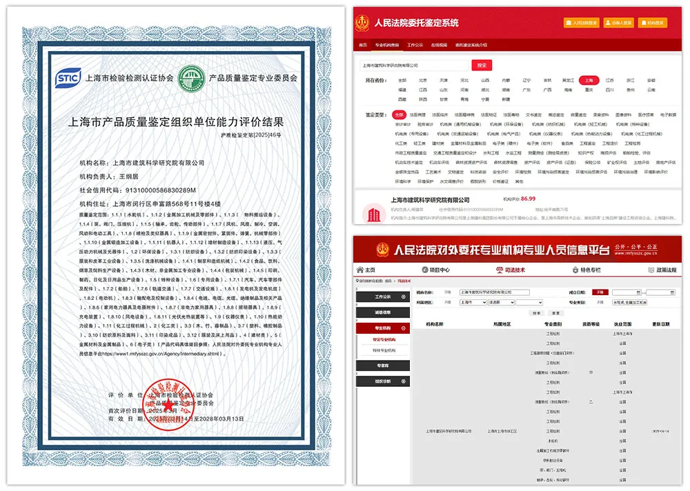 近日,上海市建筑科學(xué)研究院有限公司經(jīng)上海市檢驗(yàn)檢測認(rèn)證協(xié)會(huì)產(chǎn)品質(zhì)量鑒定專業(yè)委員會(huì)評審,成功獲批產(chǎn)品質(zhì)量鑒定組織單位能力評價(jià)資質(zhì)證書(注冊號:滬質(zhì)檢鑒定第[2025]46號),同時(shí)也成功備案人民法院對外委托專業(yè)機(jī)構(gòu)信息平臺(tái)。