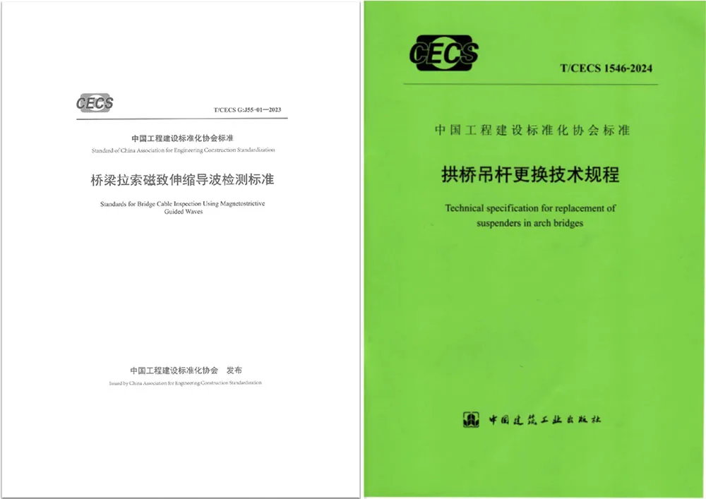 ● 檢測(cè)更新的標(biāo)準(zhǔn)化體系:主導(dǎo)編制了《拱橋吊桿更換技術(shù)規(guī)程》(T/CECS 1546-2023)和《橋梁拉索磁致伸縮導(dǎo)波檢測(cè)標(biāo)準(zhǔn)》(T/CECS G:J55-01-2023),在編上海市地方標(biāo)準(zhǔn)《拱橋吊桿檢測(cè)評(píng)定與更新技術(shù)標(biāo)準(zhǔn)》、CECS標(biāo)準(zhǔn)《磁通量法索構(gòu)件缺陷檢測(cè)規(guī)程》等行業(yè)關(guān)鍵技術(shù)標(biāo)準(zhǔn),填補(bǔ)了國(guó)內(nèi)索結(jié)構(gòu)的無(wú)損檢測(cè)、維護(hù)和更換領(lǐng)域的標(biāo)準(zhǔn)空白,推動(dòng)索結(jié)構(gòu)檢測(cè)從"經(jīng)驗(yàn)作業(yè)"向"標(biāo)準(zhǔn)化、數(shù)字化作業(yè)"轉(zhuǎn)型升級(jí),為我國(guó)橋梁管養(yǎng)水平的提升提供重要技術(shù)支撐。