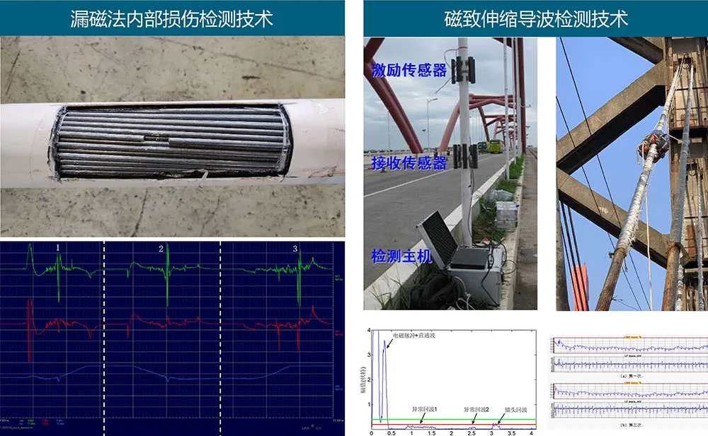 ● 內(nèi)部銹蝕無(wú)損檢測(cè)技術(shù):索結(jié)構(gòu)內(nèi)部的鋼絲銹蝕是威脅橋梁安全的重要隱患,漏磁法和磁致伸縮導(dǎo)波法作為兩種先進(jìn)的非破壞性檢測(cè)技術(shù),為索體內(nèi)部損傷識(shí)別提供了有效解決方案。