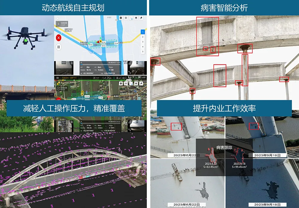 ● 無(wú)人機(jī)智能檢測(cè)技術(shù):研發(fā)了集成高清攝像與激光掃描雙模傳感的橋梁檢測(cè)無(wú)人機(jī),搭載先進(jìn)的計(jì)算機(jī)視覺(jué)算法,創(chuàng)新采用SLAM實(shí)時(shí)建圖與自適應(yīng)動(dòng)態(tài)航線(xiàn)規(guī)劃技術(shù),實(shí)現(xiàn)了復(fù)雜環(huán)境下主纜、拉吊索等高空隱蔽區(qū)域的自主避障巡檢。系統(tǒng)通過(guò)多視角影像的SIFT特征提取與SFM三維重建技術(shù),結(jié)合AI智能分析,不僅完成了橋梁結(jié)構(gòu)的全息建模,更實(shí)現(xiàn)了表觀病害的精準(zhǔn)識(shí)別與動(dòng)態(tài)追蹤。