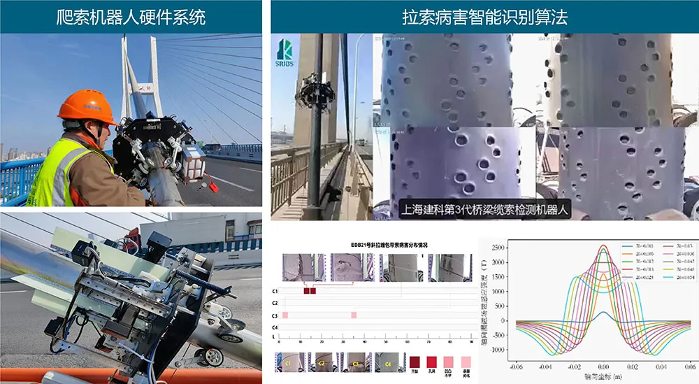● 爬索機(jī)器人檢測(cè)技術(shù):自主研發(fā)了上海首臺(tái)橋梁索結(jié)構(gòu)檢測(cè)專(zhuān)用爬索機(jī)器人系統(tǒng),實(shí)現(xiàn)高空索結(jié)構(gòu)全自動(dòng)、全覆蓋、高精度檢測(cè)。該爬索機(jī)器人采用全自主設(shè)計(jì),集成機(jī)器人控制、無(wú)線(xiàn)通信、智能爬升等六大核心系統(tǒng),具備8米/分鐘穩(wěn)定爬升能力和10公斤負(fù)載性能,通過(guò)多攝像頭協(xié)同與AI圖像識(shí)別算法實(shí)現(xiàn)360°無(wú)死角檢測(cè),確保高清影像穩(wěn)定傳輸與表觀病害精準(zhǔn)識(shí)別。