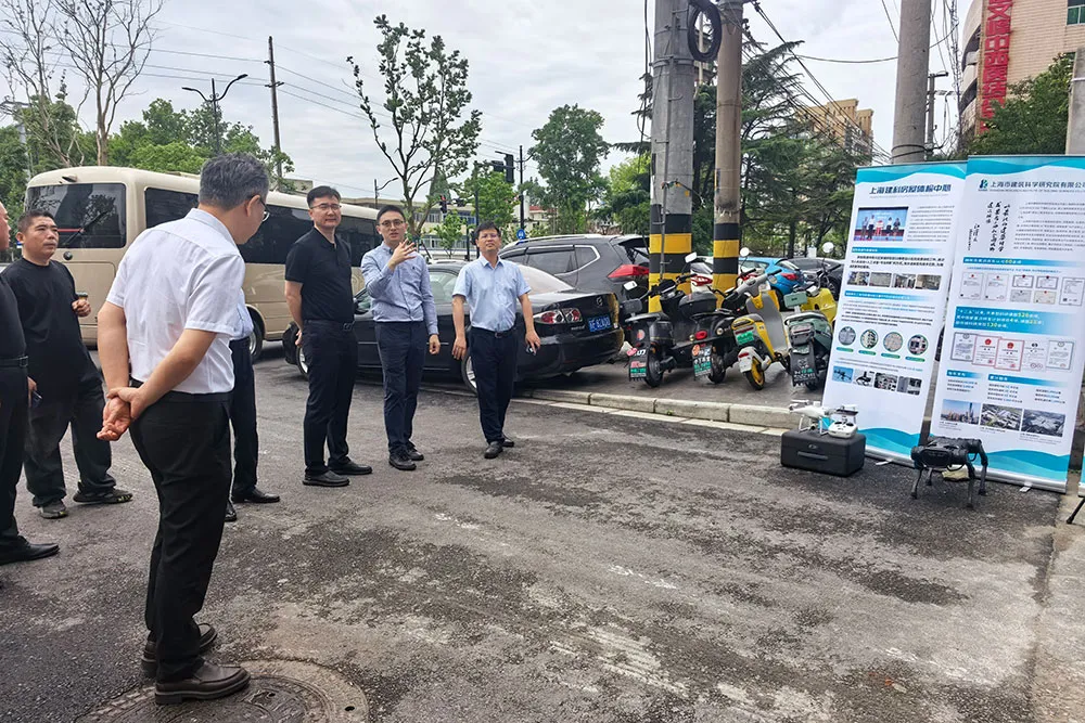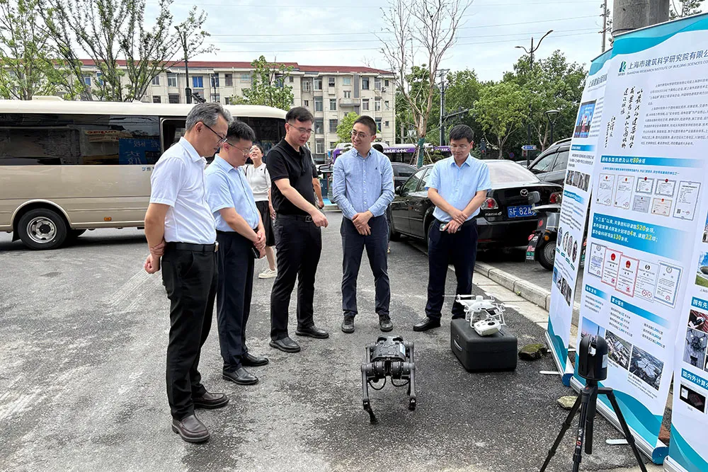 周曉杰一行實(shí)地考察了房屋體檢作業(yè)流程,重點(diǎn)了解圖紙測(cè)繪、居民入戶等環(huán)節(jié)中的重難點(diǎn)問(wèn)題,并聽(tīng)取南通市老舊小區(qū)房屋安全隱患現(xiàn)狀的匯報(bào)。上海建科院結(jié)構(gòu)所區(qū)域拓展中心主任陳馳向調(diào)研組系統(tǒng)介紹了基于南通市房屋體檢導(dǎo)則、融合上海經(jīng)驗(yàn)形成的“無(wú)人機(jī)巡查+人工詳查+專業(yè)判斷”工作模式?,F(xiàn)場(chǎng)通過(guò)無(wú)人機(jī)、機(jī)器狗等數(shù)字化設(shè)備演示,直觀呈現(xiàn)了智能化檢測(cè)技術(shù)在房屋結(jié)構(gòu)評(píng)估、隱患識(shí)別中的高效應(yīng)用。調(diào)研組圍繞房屋體檢制度建設(shè)、管理機(jī)制、技術(shù)規(guī)范及成本控制等議題展開(kāi)深入交流。