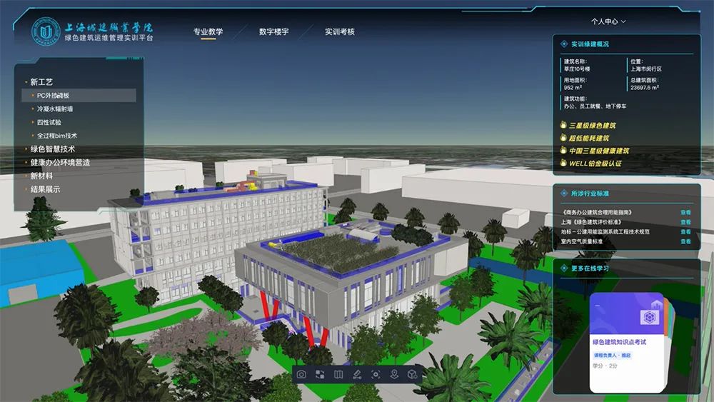 作為項目重要成果,實訓(xùn)平臺以特定綠色建筑高精度BIM模型為實訓(xùn)對象,通過全景漫游、專業(yè)教學(xué)、數(shù)字樓宇和實訓(xùn)考核等方式,面向多種用戶,實現(xiàn)了綠色建筑和建筑節(jié)能專業(yè)知識在線學(xué)習(xí)、綠色建筑數(shù)字化表達和統(tǒng)計分析、綠色建筑日常典型運維管理情景仿真實訓(xùn)和考核等功能應(yīng)用,采用沉浸體驗、主動巡查、專業(yè)答題、仿真操作等方式,實現(xiàn)引導(dǎo)用戶“做中學(xué),學(xué)中做,邊做邊學(xué),寓教于樂”的效果。