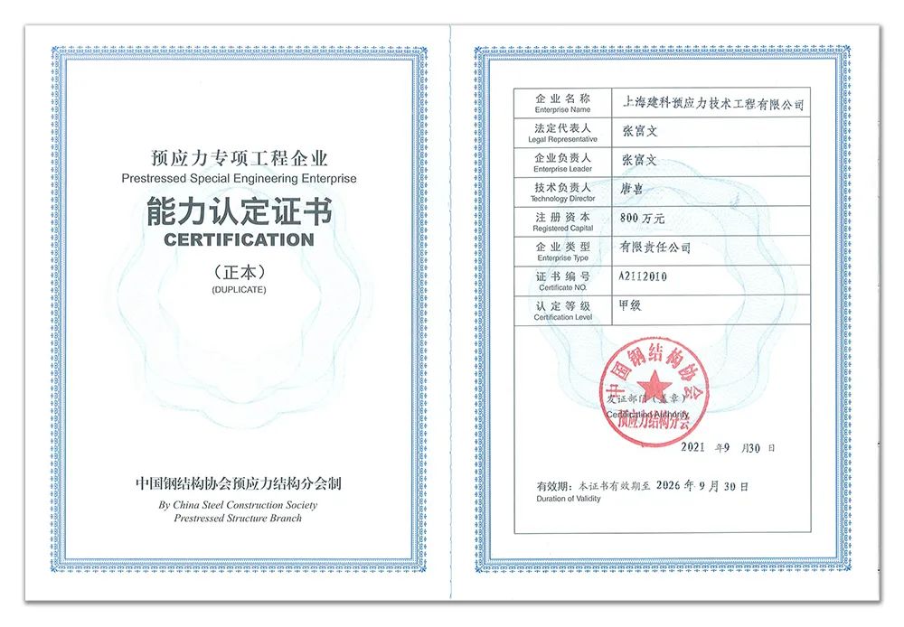 近期,中國鋼結構協(xié)會預應力結構分會組織行業(yè)專家對上海建科預應力技術工程有限公司(以下簡稱“預應力公司”)的預應力工程施工能力開展評定,從技術裝備、人員配置、財務狀況、工程業(yè)績、科學管理和質量保證體系等方面進行了全面考察,并授予預應力公司預應力專項工程甲級企業(yè)能力認證證書。根據(jù)預應力專項工程甲級企業(yè)承包工程范圍的規(guī)定,預應力公司可承擔各類預應力工程的施工。