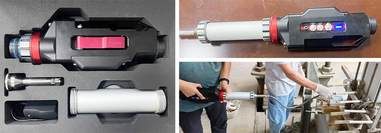 上海建科院與上海西派埃自動化儀表工程有限責任公司聯(lián)合研發(fā)的便攜式智能補灌儀主要由驅(qū)動部分、絲桿、活塞、漿料桶、連接環(huán)和錐形注漿頭組成,利用電機帶動絲桿的旋轉(zhuǎn)作用,驅(qū)動活塞將灌漿料從注漿頭中推出,實現(xiàn)鋼筋套筒灌漿料的自動化補充注漿作業(yè)。該儀器具有補灌工藝自動化、智能化,小口徑、小流速、小灌注量補灌,灌漿速度可調(diào)、料管可拆卸、可吸漿,便攜、輕量化等顯著優(yōu)勢。